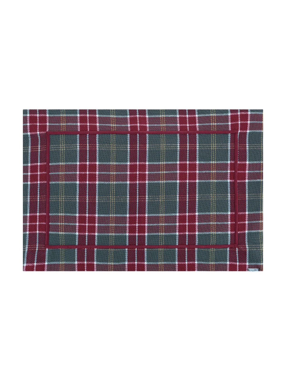 Lugar Americano na estampa xadrez com as cores verde musgo, vermelho e branco em tecido jacquard e detalhes de fio de lurex.